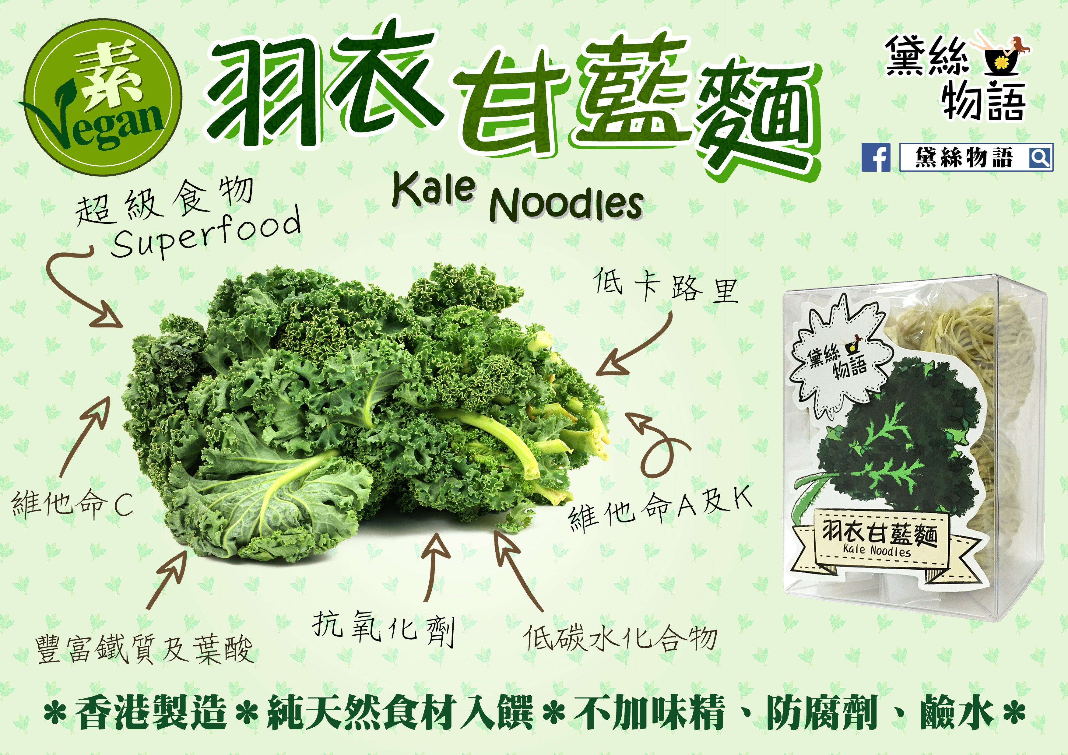 產品簡介健康飲食及休閒生活為理念的香港品牌適合凍熱兩食全素產品,適合素食人士。香港製造非油炸、不加味精、防腐劑及鹼水每個麵獨立包裝,300克/6個 產品資訊成份:高筋麵粉、水、新鮮羽衣甘藍、羽衣甘藍粉、生粉、鹽水。致敏原:本產品含有麩質(小麥)。生產機器亦可能處理甲殼類動物、魚類、蛋類及大..