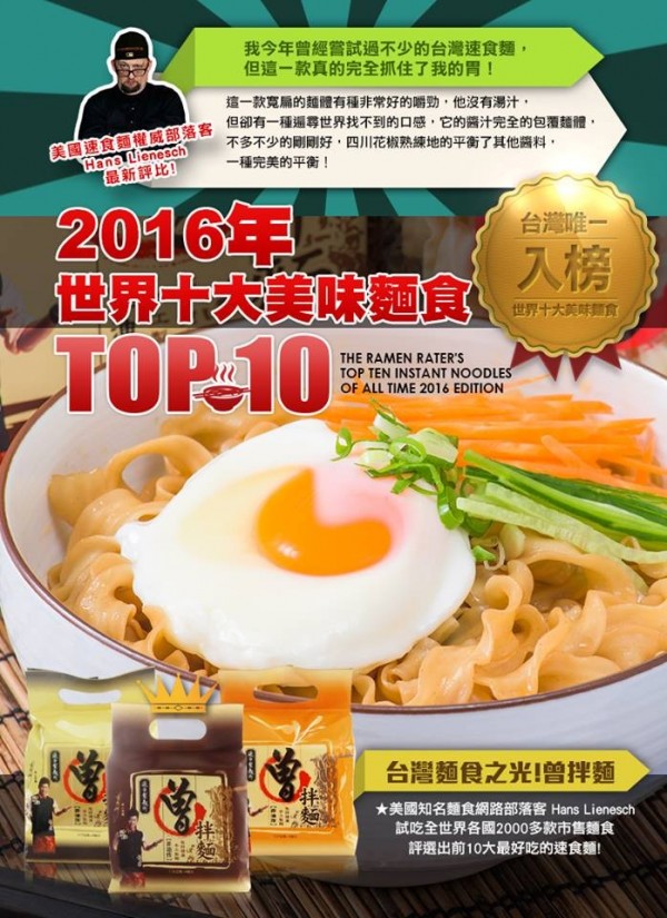 • 美國麵食權威部落客 Hans Lienesch 評為2016 全球10大美味泡麵之一。