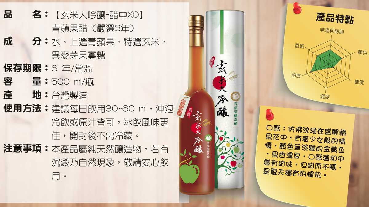 上等玄米加入不同成份於橡木桶發酵純天然釀造物
