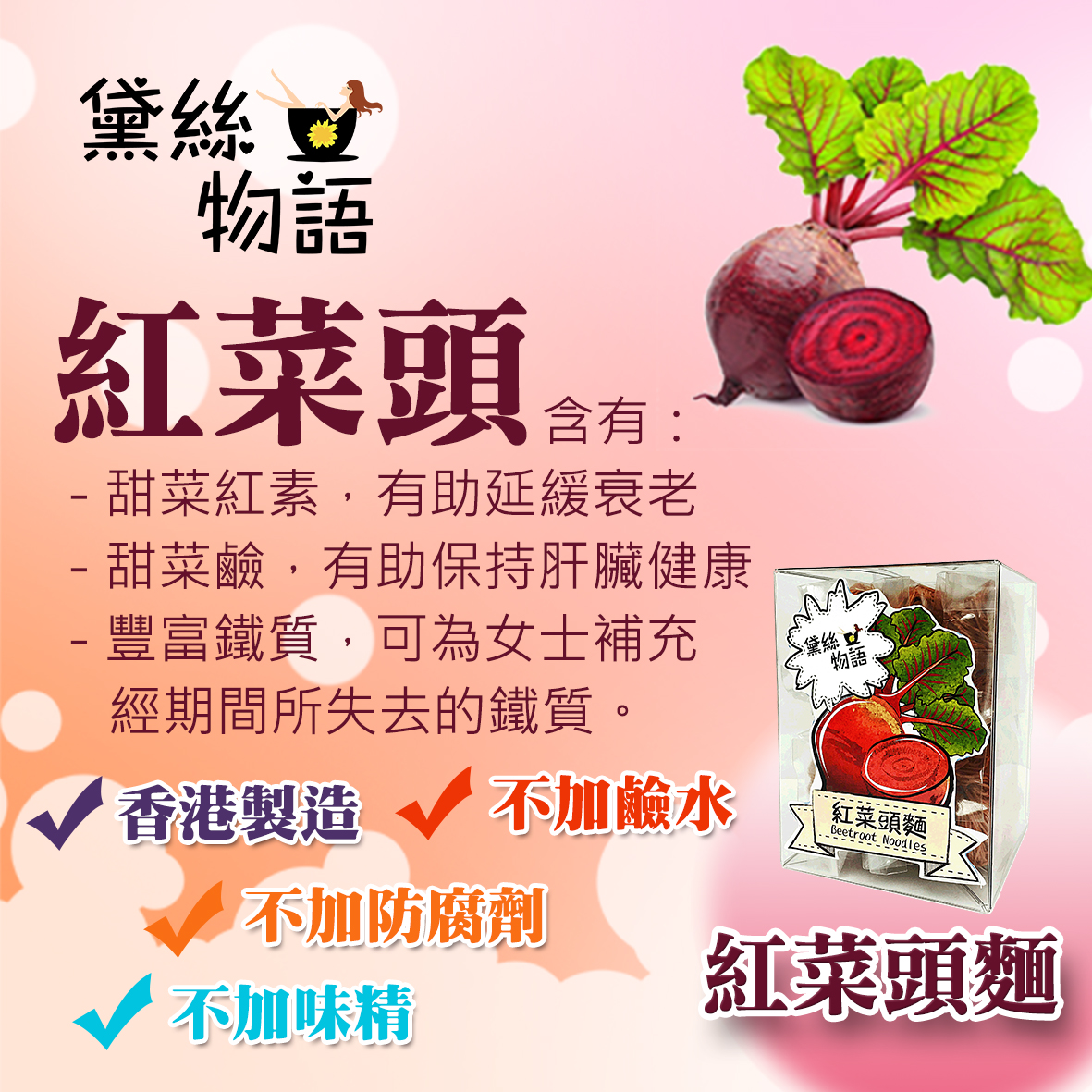 產品簡介健康飲食及休閒生活為理念的香港品牌全素產品,適合素食人士。德國製造 產品資訊成份:紅菜頭請存放於乾爽處, 避免陽光直接照射..